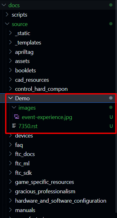 /sourcefolder. You can do this by right-clicking on thesourcefolder and selecting “New Folder” and then typing in your name. E.g. “Demo”.Create a new file within the folder you just created. You can do this by right-clicking on the folder you just created and selecting “New File” and then typing in the name of the file. E.g. “7350.rst”.