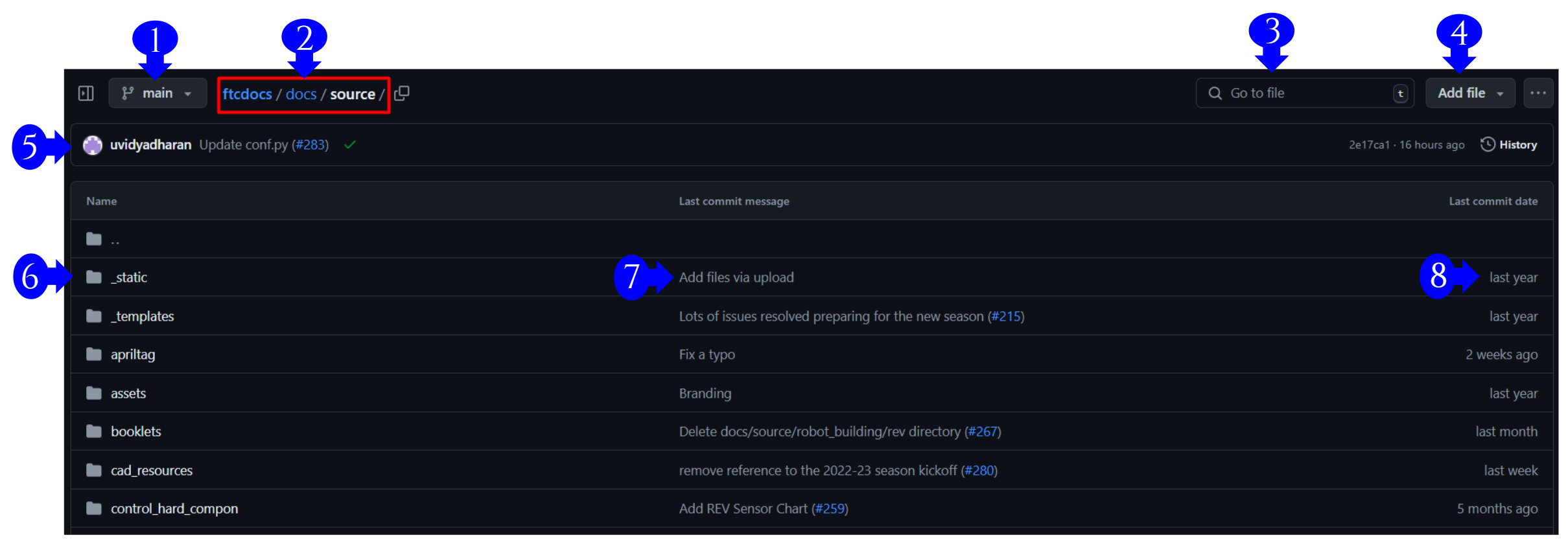 We’re going to call the first folder in the repository the “repository main folder”. This is the main folder where viewers of the repository can get important information regarding what the repo is for, what license the repository is managed by, and so on. As a contributor of this repository, most of the content here will not be important to you.