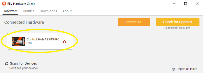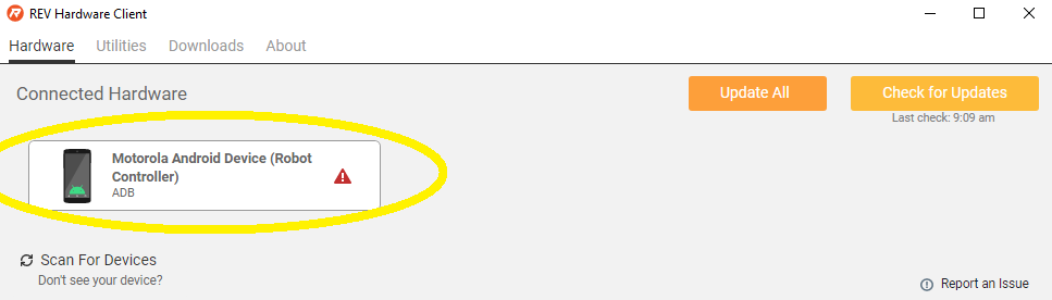 If the phone is not recognized, ensure that the phone has developer options enabled. If necessary, click the “Scan for Devices” button in the lower-left of the REV Hardware Client app to force the RHC to rescan devices.