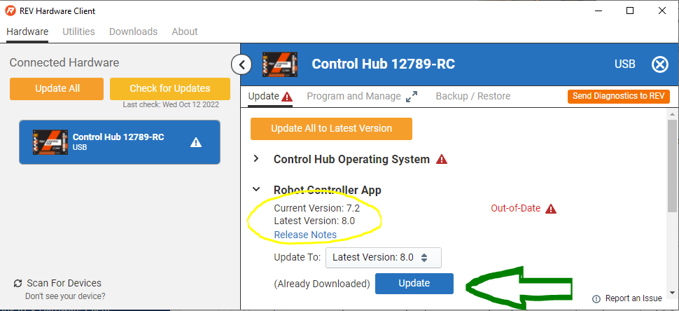 Once recognized, click on the Control Hub’s large icon/rectangle. The RHC app now displays the update status of the RC app, if any.