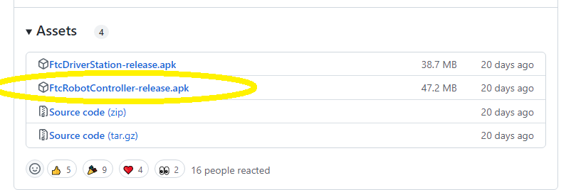 In the next page, scroll down slightly in the “Latest” section, to the short list of “Assets”. Click on the file “FtcRobotController-release.apk”, to download it to your computer.