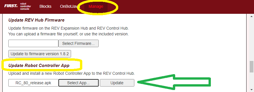 http://192.168.43.1:8080Click the Manage tab, then scroll down to “Update Robot Controller App”.