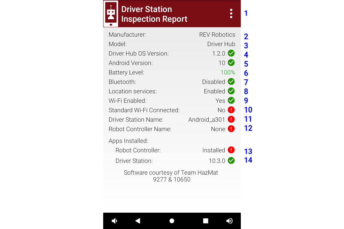 Robot Controller Name. It will show None if not connected. It will show an error if team number portion of the Robot Controller and Driver Station names do not match. It does not check whether the RC name matches FTC format requirements. See the Robot Controller Self Inspection Report.Item 13 Apps Installed