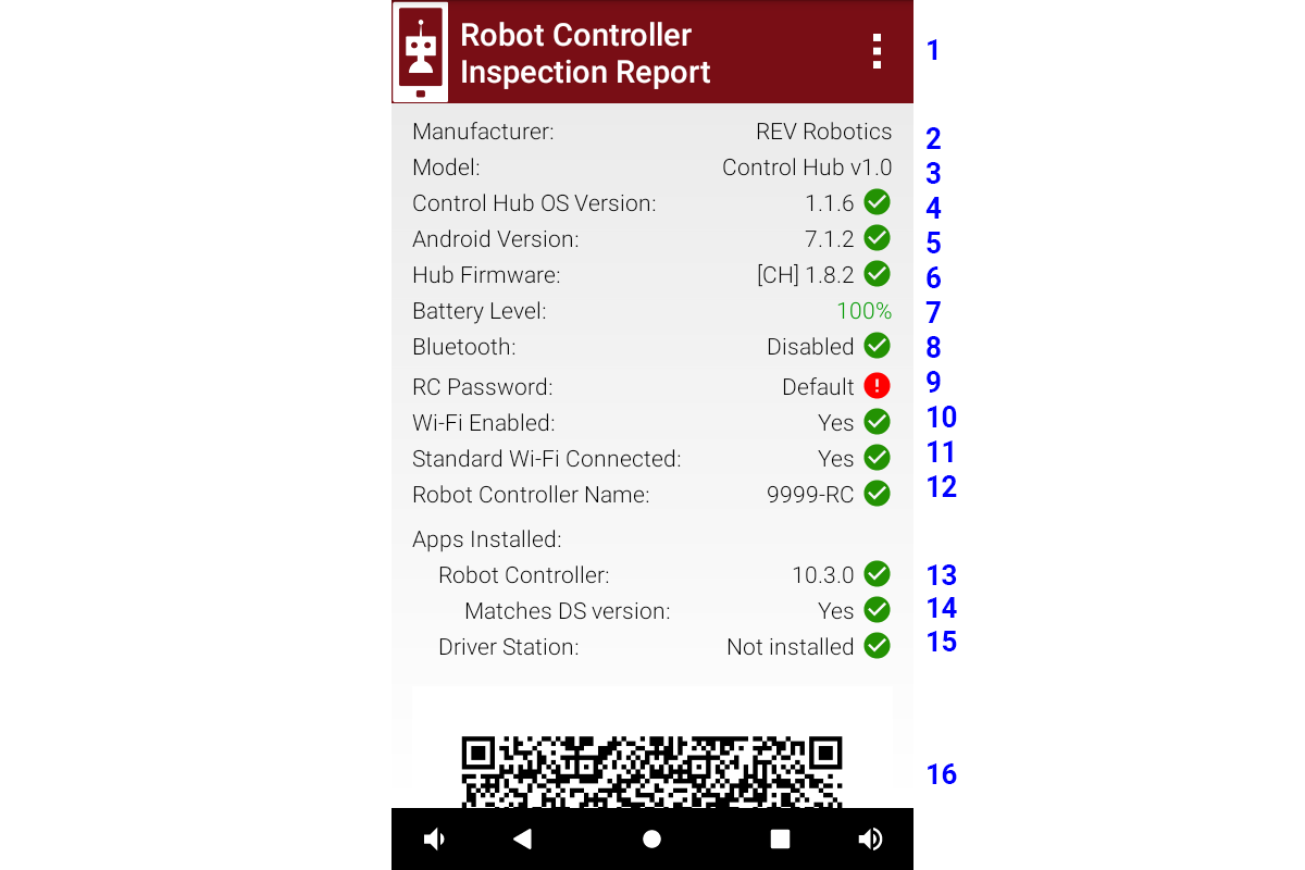 Driver Stationshould be Not installed, this verifies that the Robot Controller device does not also have a Driver Station app installed. Only one FTC app should be installed on each device. It’s possible to accidentally install both apps, but this usually causes the apps to not work properly.Item 16 At the bottom of the RC inspection report is a QR Code that can be scanned during inspection to fill in many of the inspection checklist items if the inspector is using a tablet.