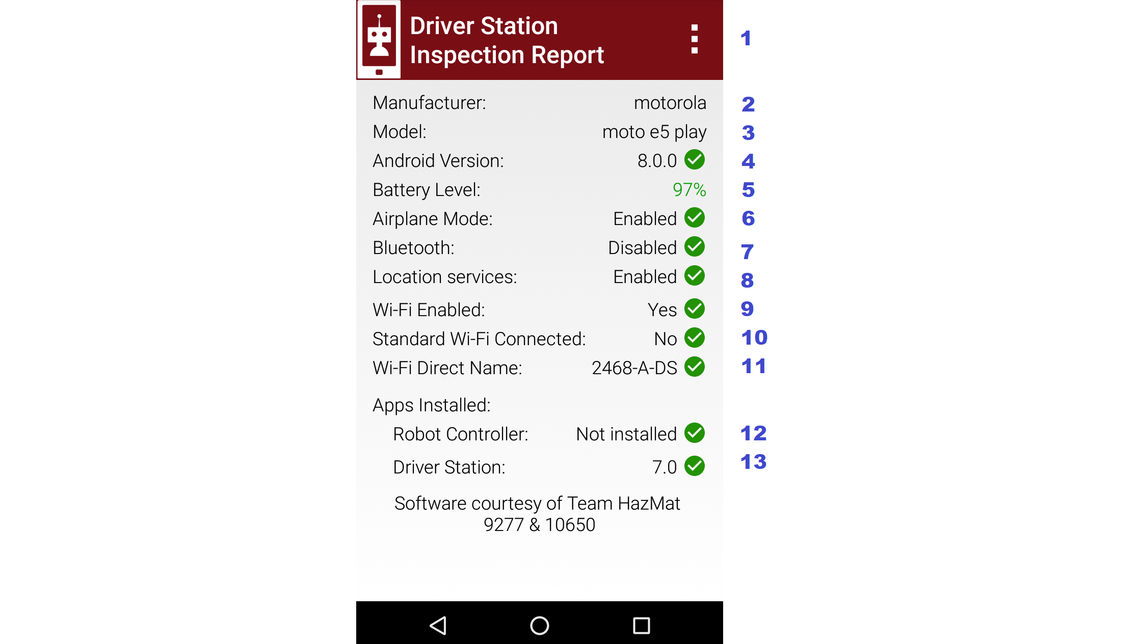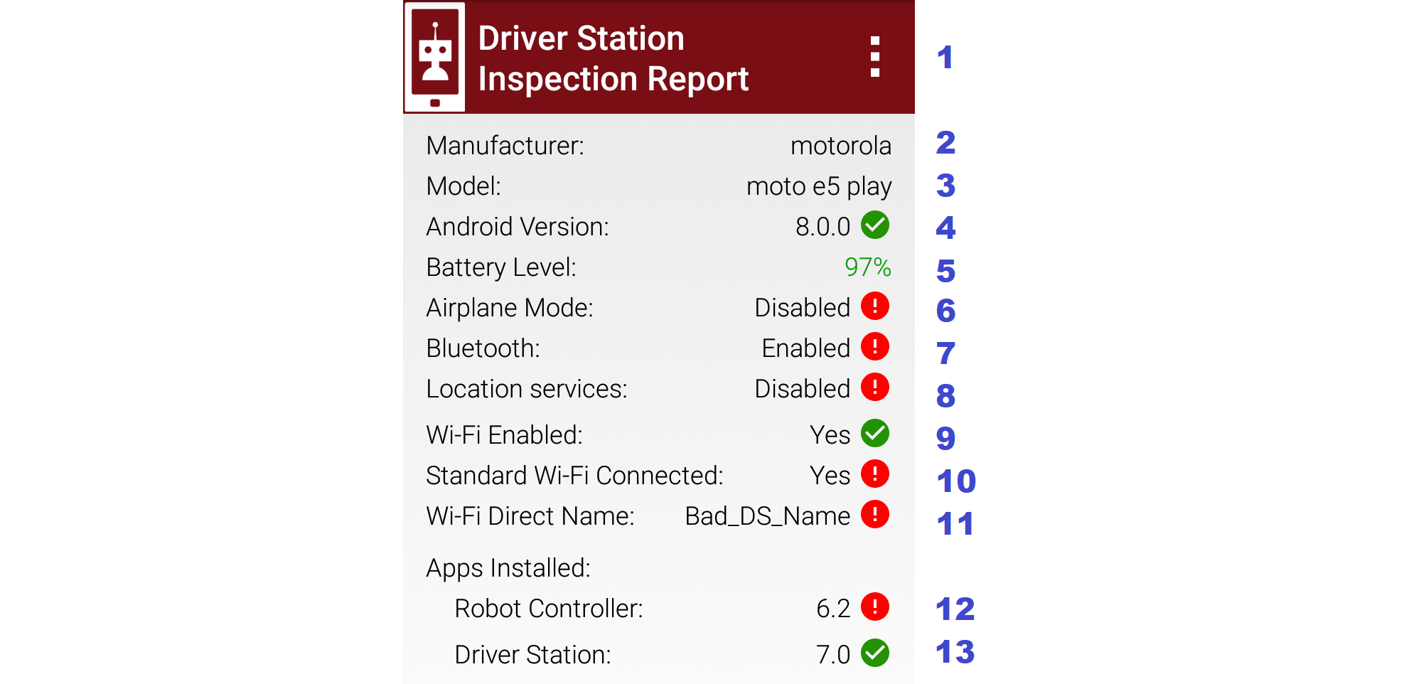 Item 11 rejects the device’s Wi-Fi Direct name for not meeting FTC format requirements. The bad name shown here was created in the DS phone’s Android Wi-Fi Direct settings; not possible using the app’s DS Settings (Driver Station Name).
