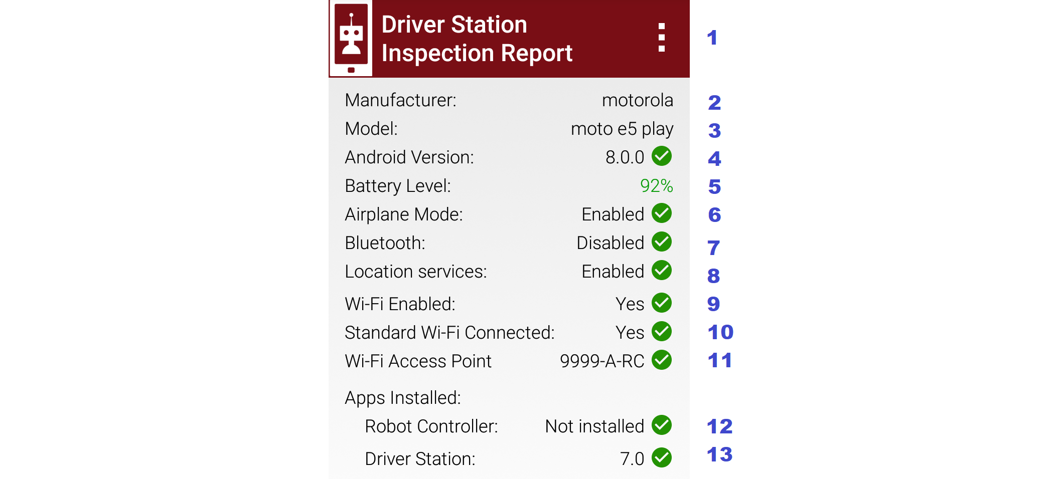 Item 11 shows the Standard Wi-Fi network name, or Access Point (AP), that the DS phone is connected to. The check-mark indicates the AP is an FTC legal device (Control Hub) and has a correctly formatted name. This does not check that the DS and RC names match (team number). In fact, this phone is 2468-A-DS and this Control Hub is 9999-A-RC, an illegal combination to be flagged by the FTC team or the Robot Inspector.