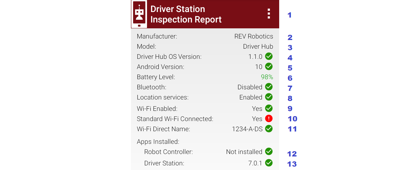 Item 11 shows the Standard Wi-Fi network name, or Access Point (AP), that the Driver Hub is connected to. The check-mark indicates the AP is an FTC legal device (Control Hub) and has a correctly formatted name. This does not check that the DS and RC names match (team number). In fact, this Driver Hub is 1234-A-DS and this Control Hub is 9999-A-RC, an illegal combination to be flagged by the FTC team or the Robot Inspector.