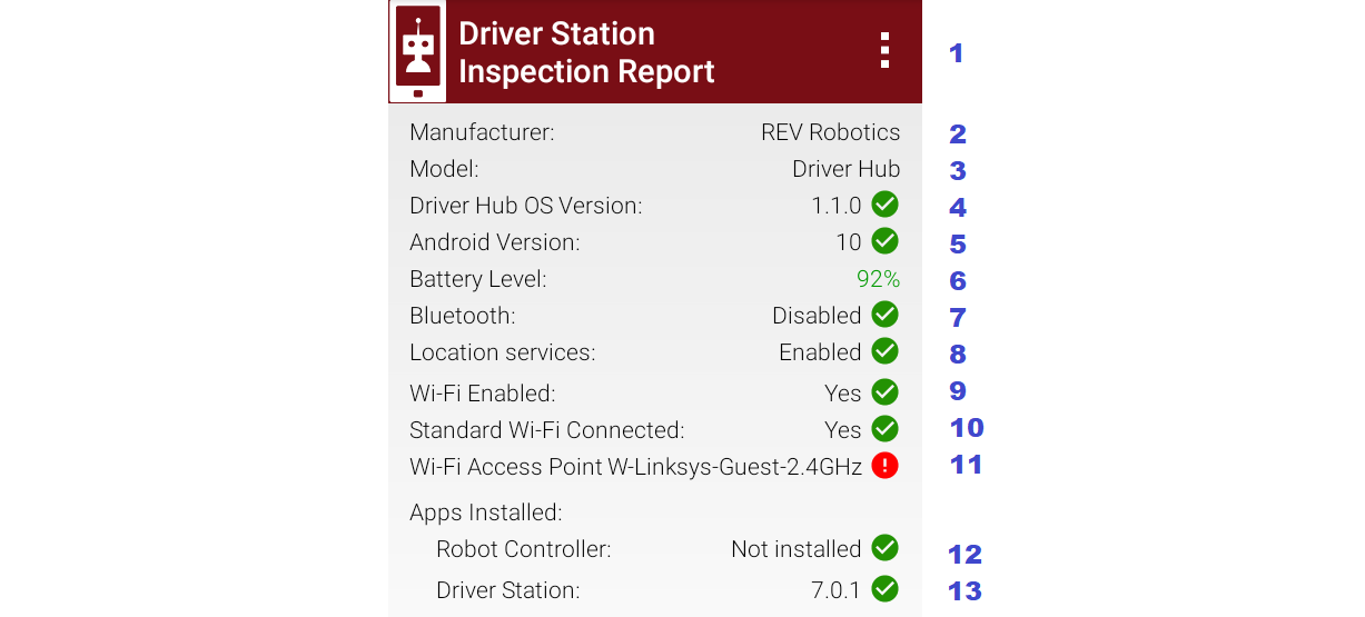 Item 13 ensures the DS app meets the minimum version for the current FTC season, based on the device’s system date. This particular version 7.0.1 does not exactly match the RC phone’s 7.0. Such a “Point mismatch” is allowed under updated FTC rules (was Q&A #176 for 2021-2022 season). Otherwise, an “incorrect” red mark here can be cleared by correcting the date in the Android device Settings.