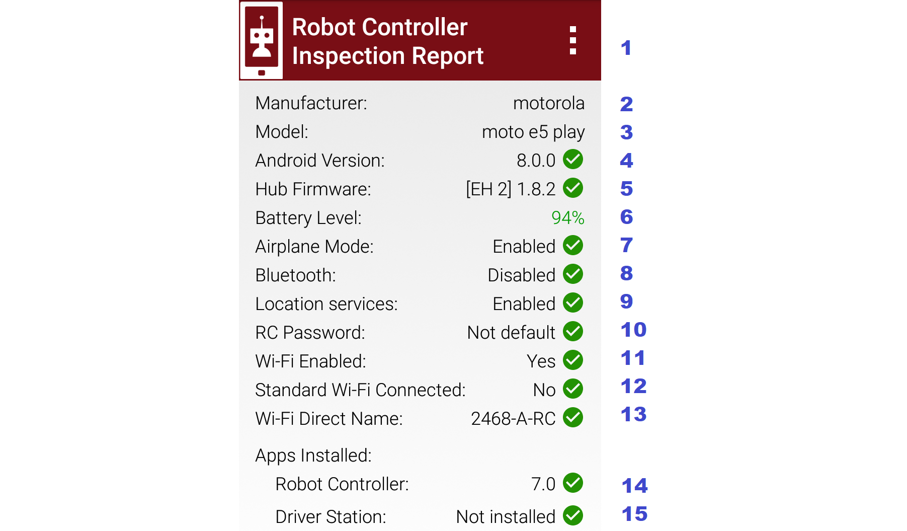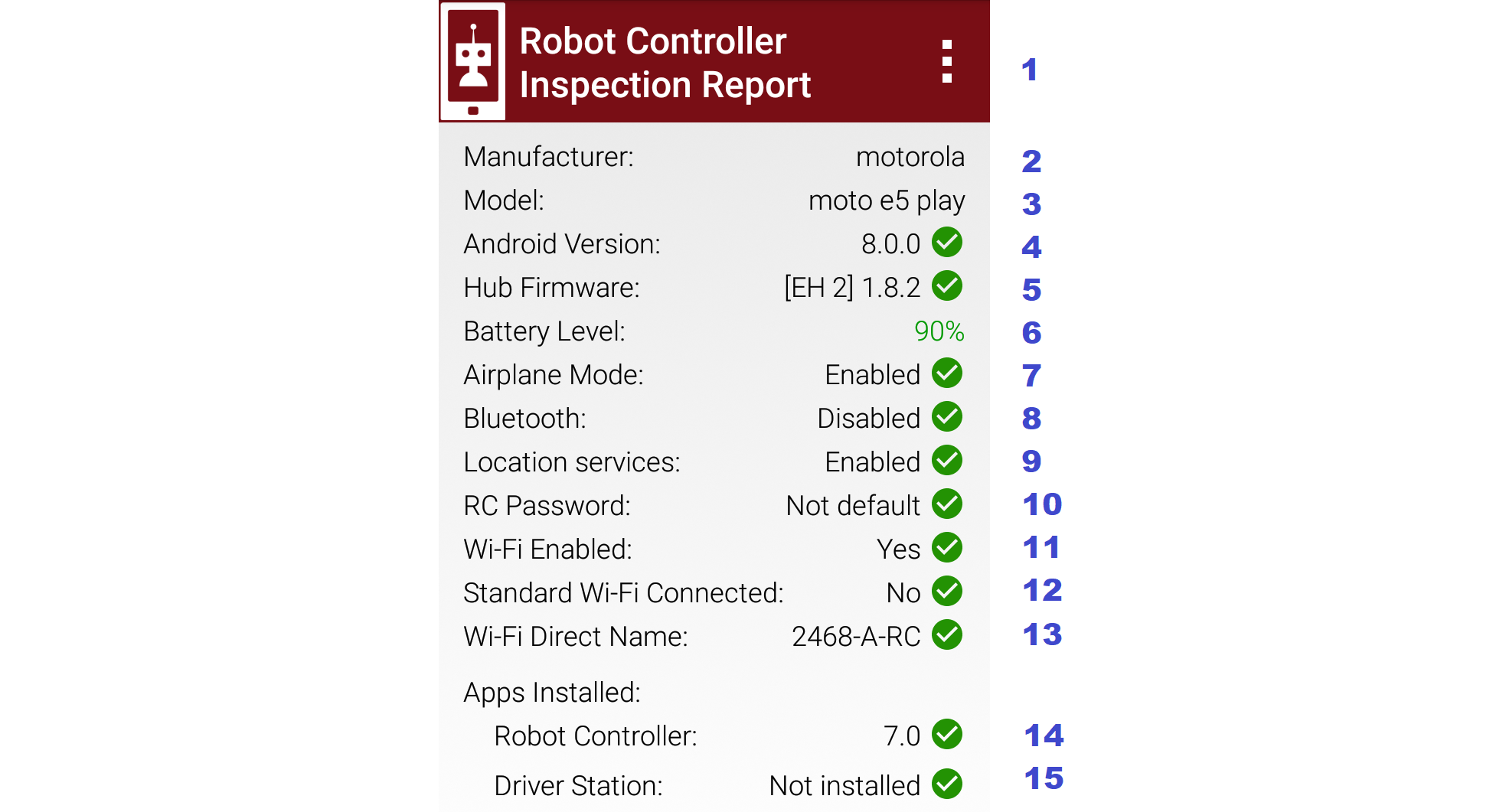 Item 12 shows the Standard Wi-Fi network name, or Access Point (AP), that is broadcast by the Control Hub. The check-mark indicates the AP has a correctly formatted FTC name. This does not check that the DS and RC names match (team number). In fact, this DS phone is 2468-A-DS and this Control Hub is 9999-A-RC, an illegal combination to be flagged by the FTC team or the Robot Inspector.