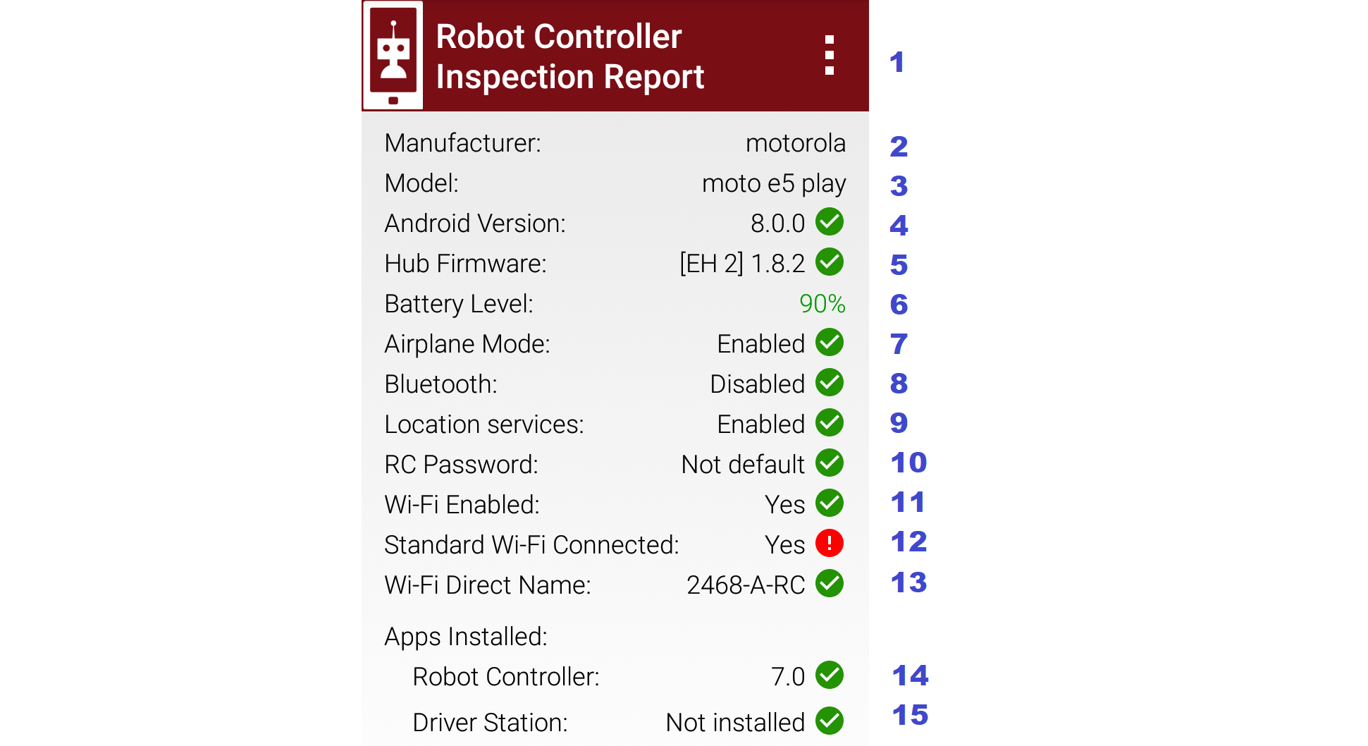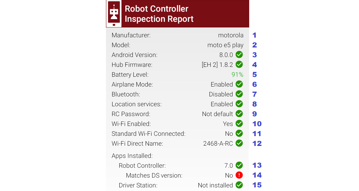 Item 14 did not appear on the RC phone’s display of this RC Self Inspect. Here is the check for matching versions of the DS app and RC app. In this case, the DS app is 7.0.1 and the RC app is 7.0, rejected here as a mismatch. Such a “Point mismatch” is allowed under updated FTC rules (was Q&A #176 for 2021-2022 season).