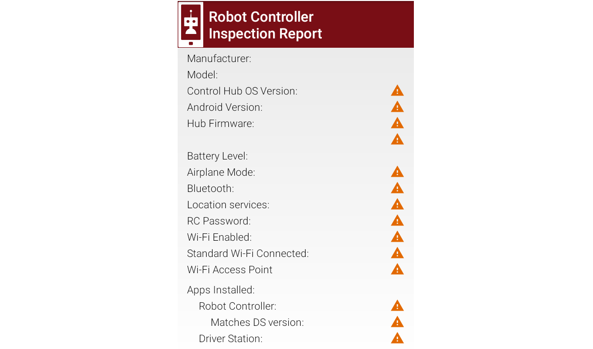 The Self Inspect screen is provided only as a quick, handy reference to help teams confirm that certain control system elements are up-to-date and properly configured. Self Inspect may be reviewed in Robot Inspection at an FTC tournament, but is not a comprehensive or official standard of compliance with FTC rules.